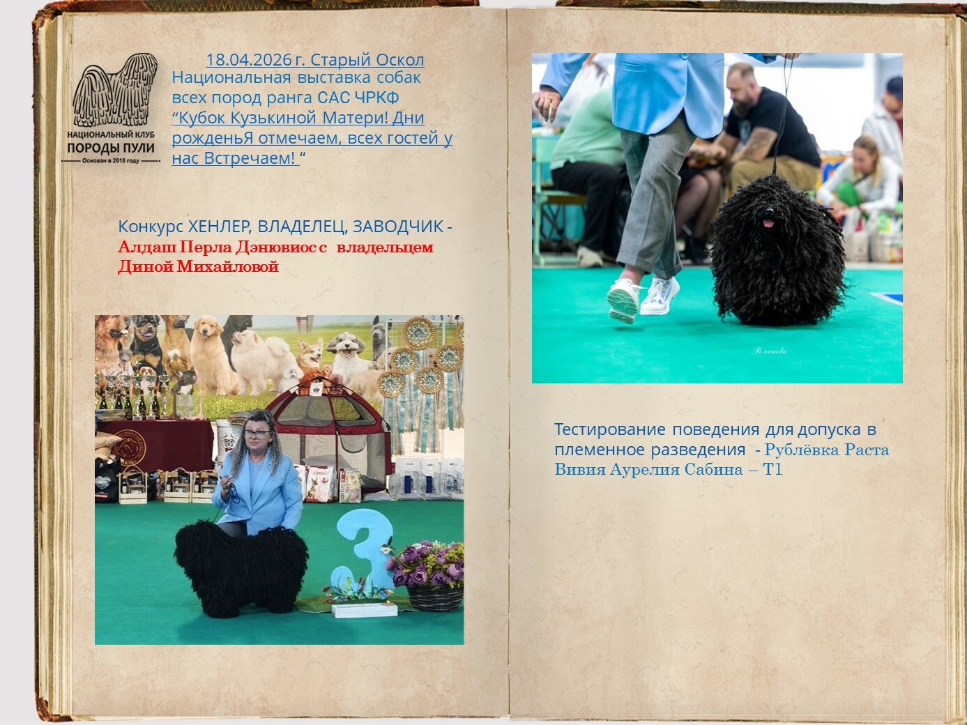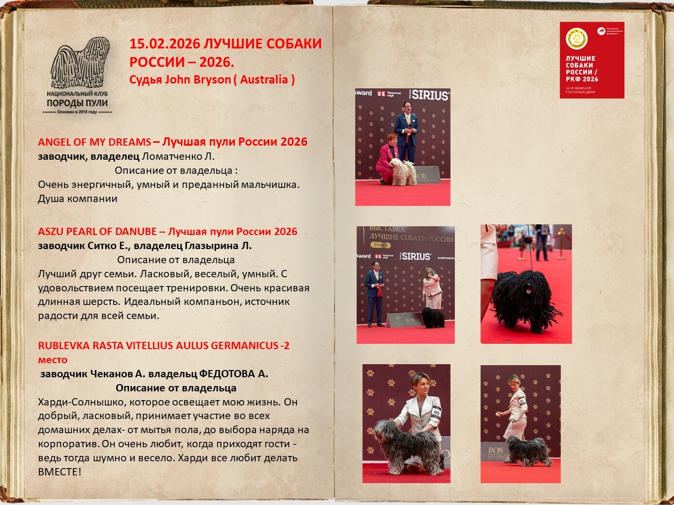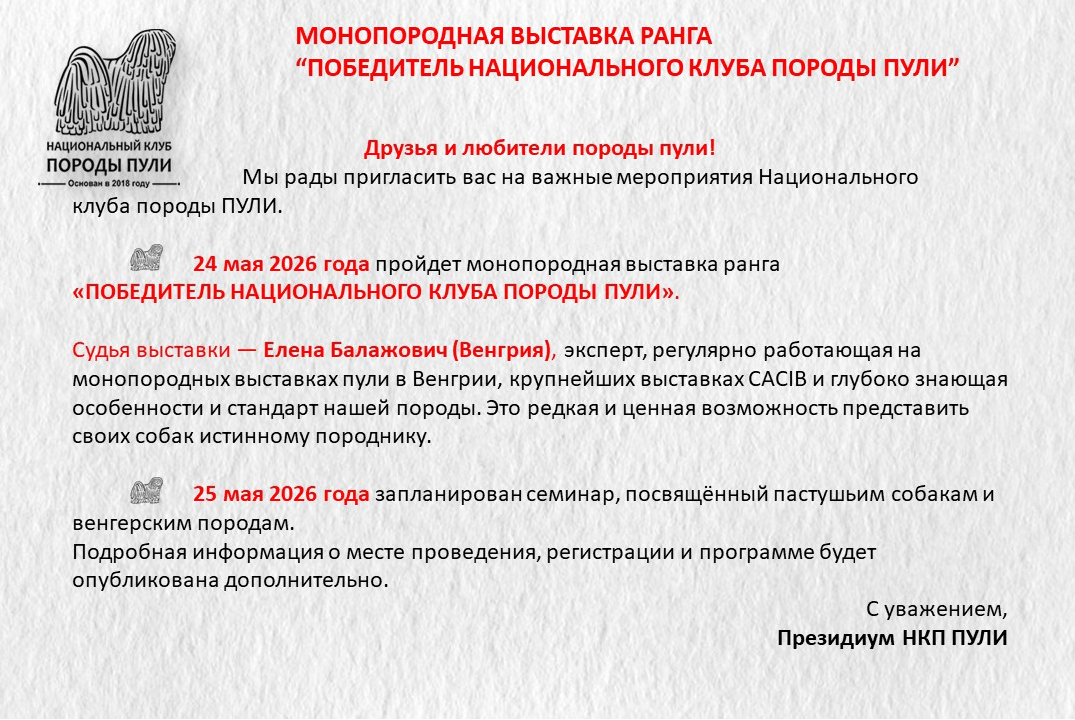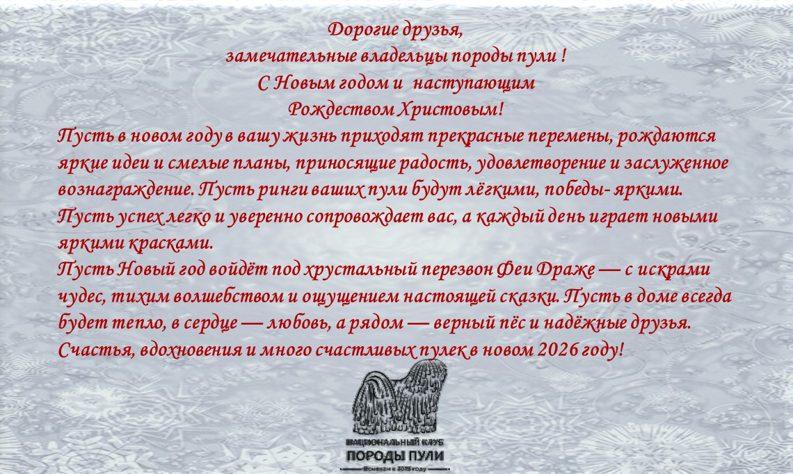 Уважаемые владельцы пули, все вы знаете о нашей базе пули, которую мы стремимся всячески пополнять и развивать. Для более презентабельных представлений вашего пули на странице базы, присылайте на почту НКП nkp.puli@yandex.ru фото в стойках, дипломы достижений на выставках, титулы и тесты. Эти данные будут вносится в базу при подтверждающих документах.