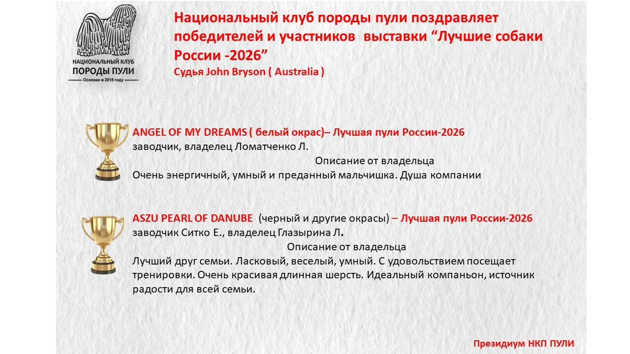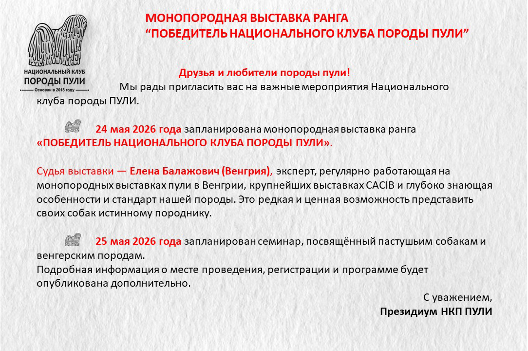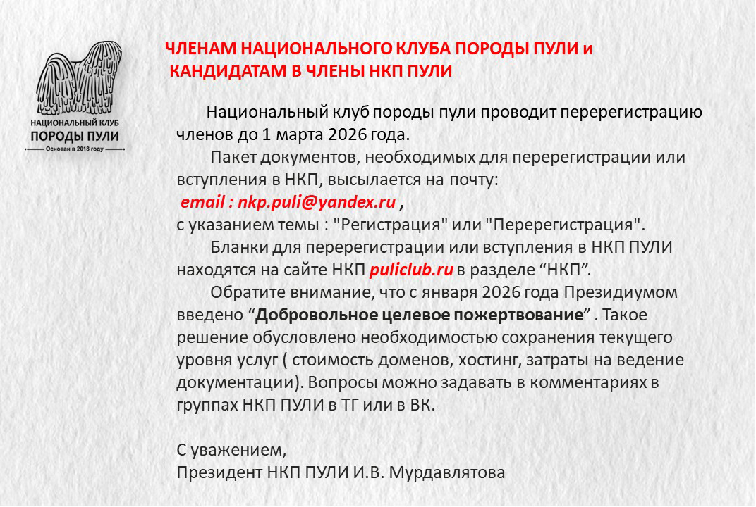 Уважаемые владельцы пули, все вы знаете о нашей базе пули, которую мы стремимся всячески пополнять и развивать. Для более презентабельных представлений вашего пули на странице базы, присылайте на почту НКП nkp.puli@yandex.ru фото в стойках, дипломы достижений на выставках, титулы и тесты. Эти данные будут вносится в базу при подтверждающих документах.